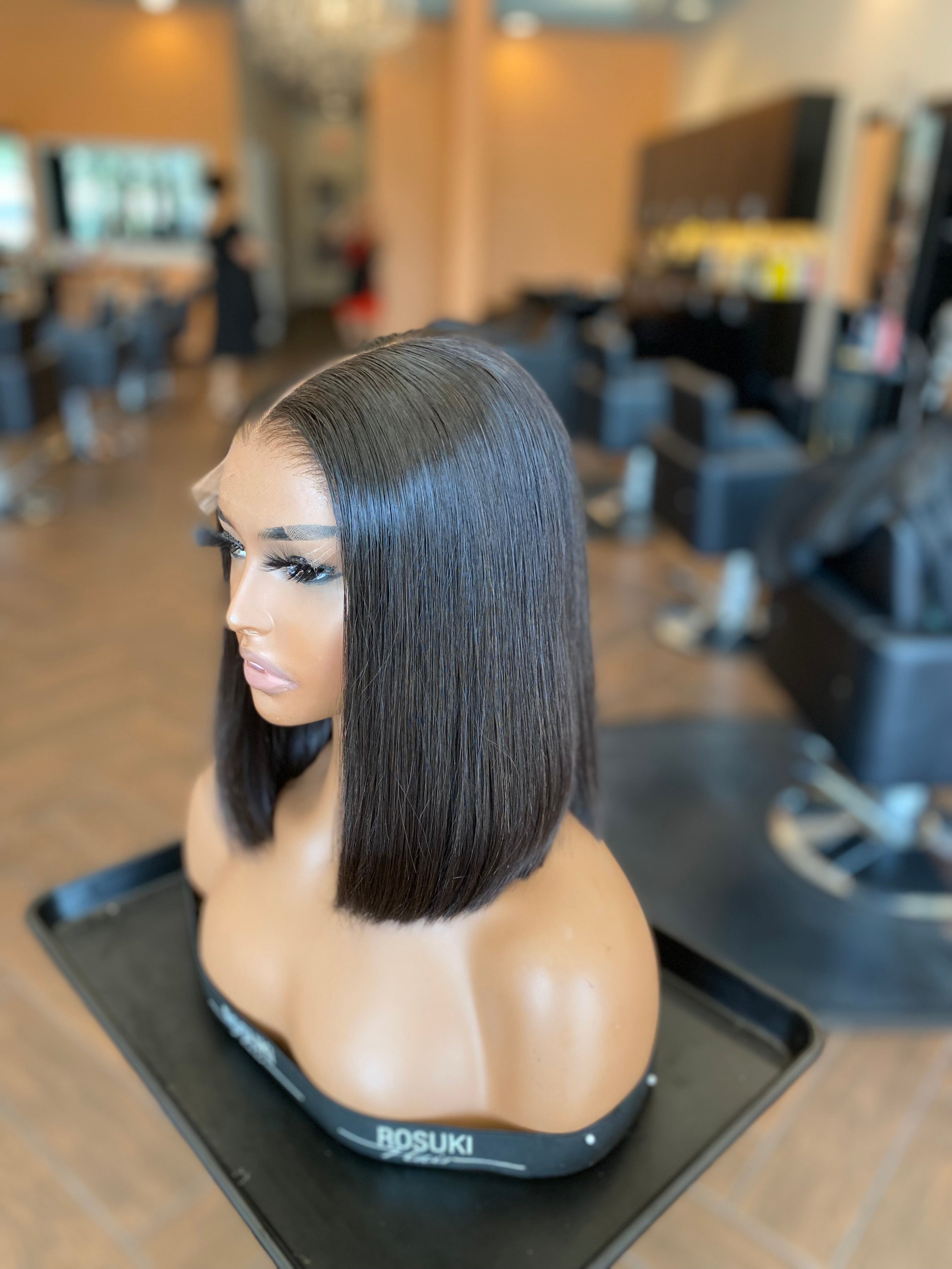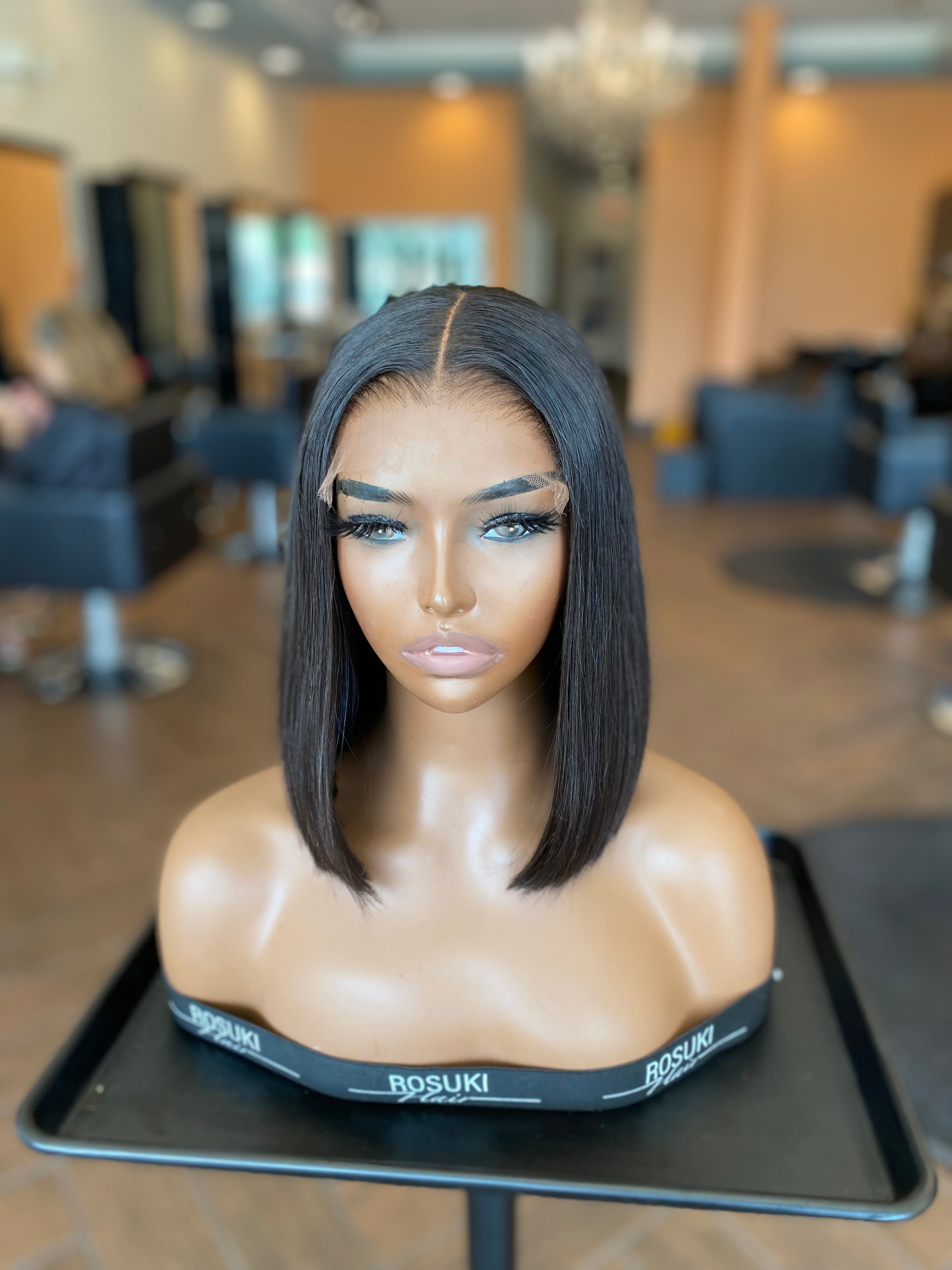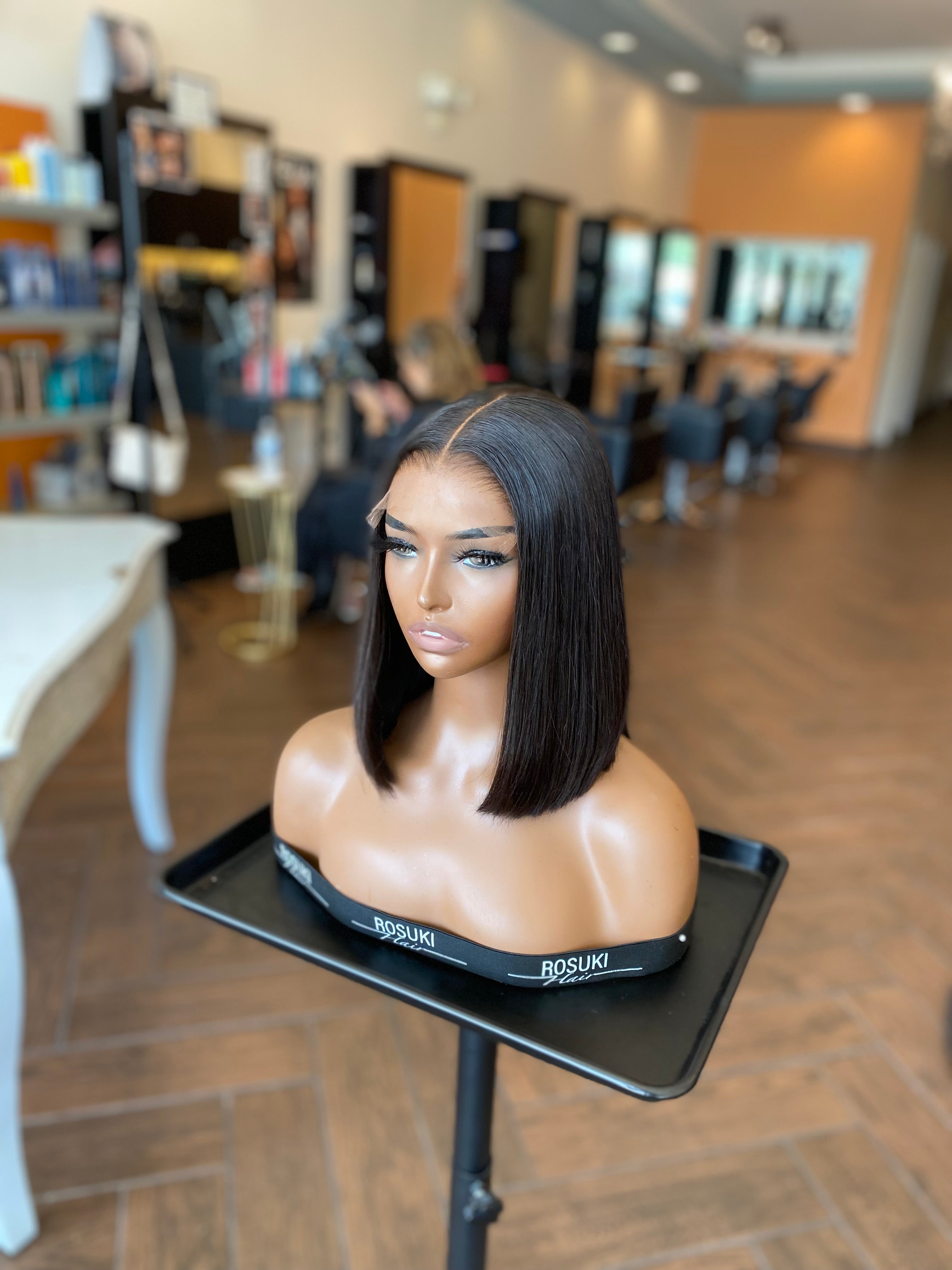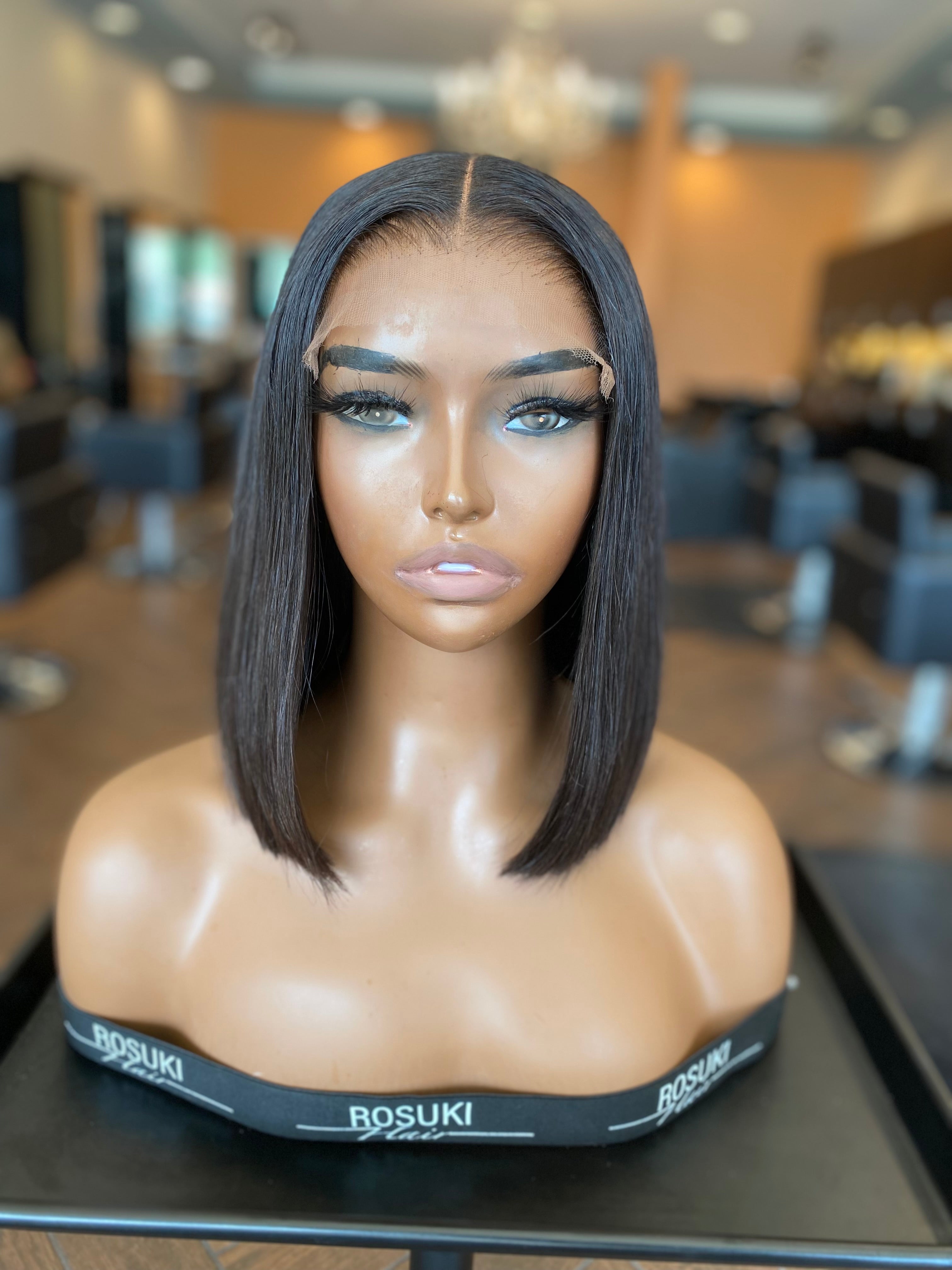 IMPORTANT INFORMATION, PLEASE READ!It is very important to know the circumference of your head measurement because it is needed to know which wig cap size will fit your head. If you are a half a size, its recommended to go up a size.Medium size cap fits most people and you can adjust the elastic band to fit properly, with that being said, Rosuki Hair will not take any responsibility if the cap does not fit right, so you have to know your head measurements. All machine made units are ready to be worn right out of the packaging after makeup (foundation/ lace tint) is used to blend transparent/ HD lace! TURNAROUND: Ships in 7-14 business days ALL SALES ARE FINAL ROSUKI BOB Hair length: 12 inches Cap size : medium (22-22.5") Construction: machine wefted 100% Glueless (can be worn with or without glue) Hair Type: 100% Raw Peruvian hair Bundles used: 3 bundles and a 5x5 transparent closure Hair color: Black Hairline: semi pre-plucked Elastic Band : YES Bleached Knots : YES Mini wig combs : 3 processing time 7-14 business days