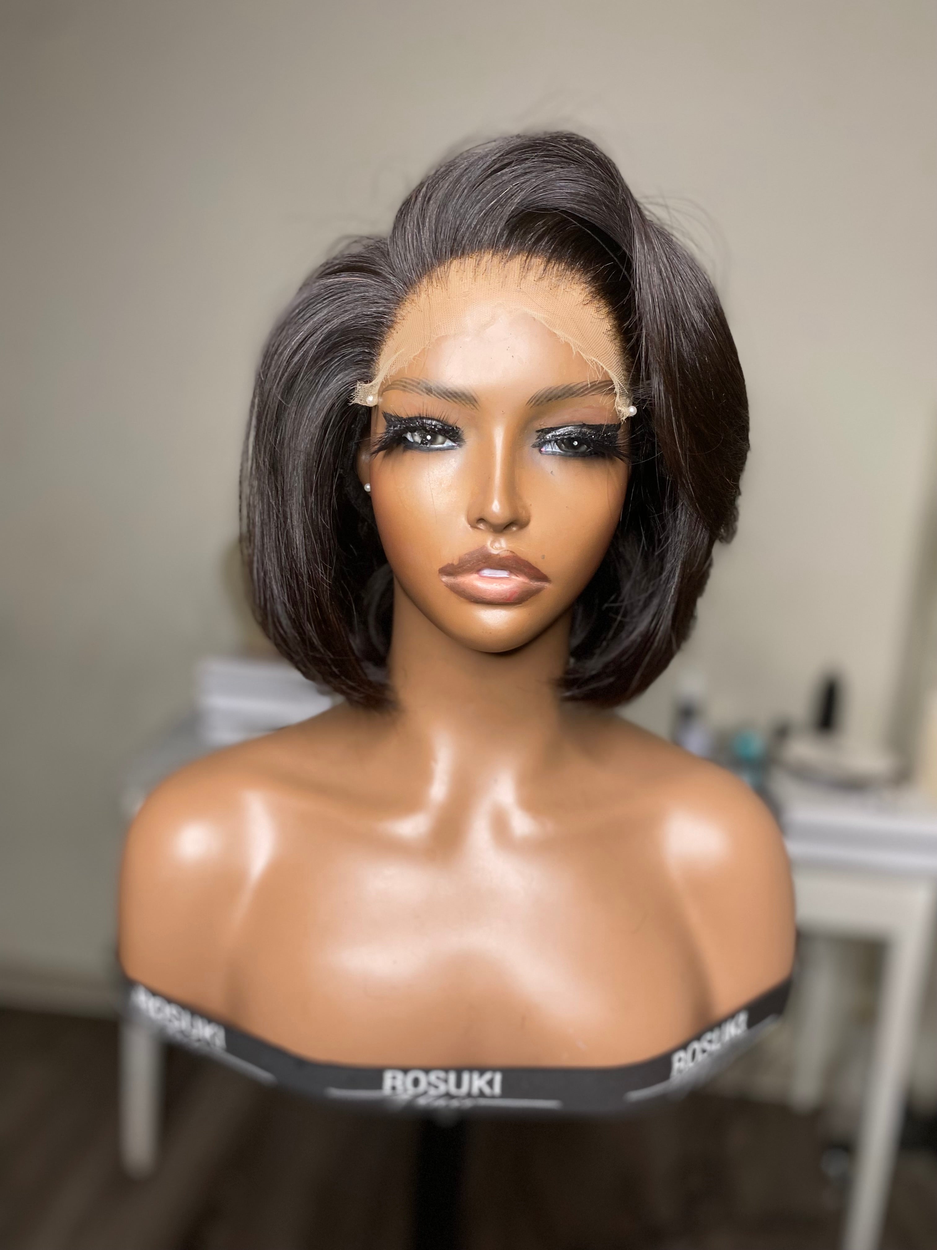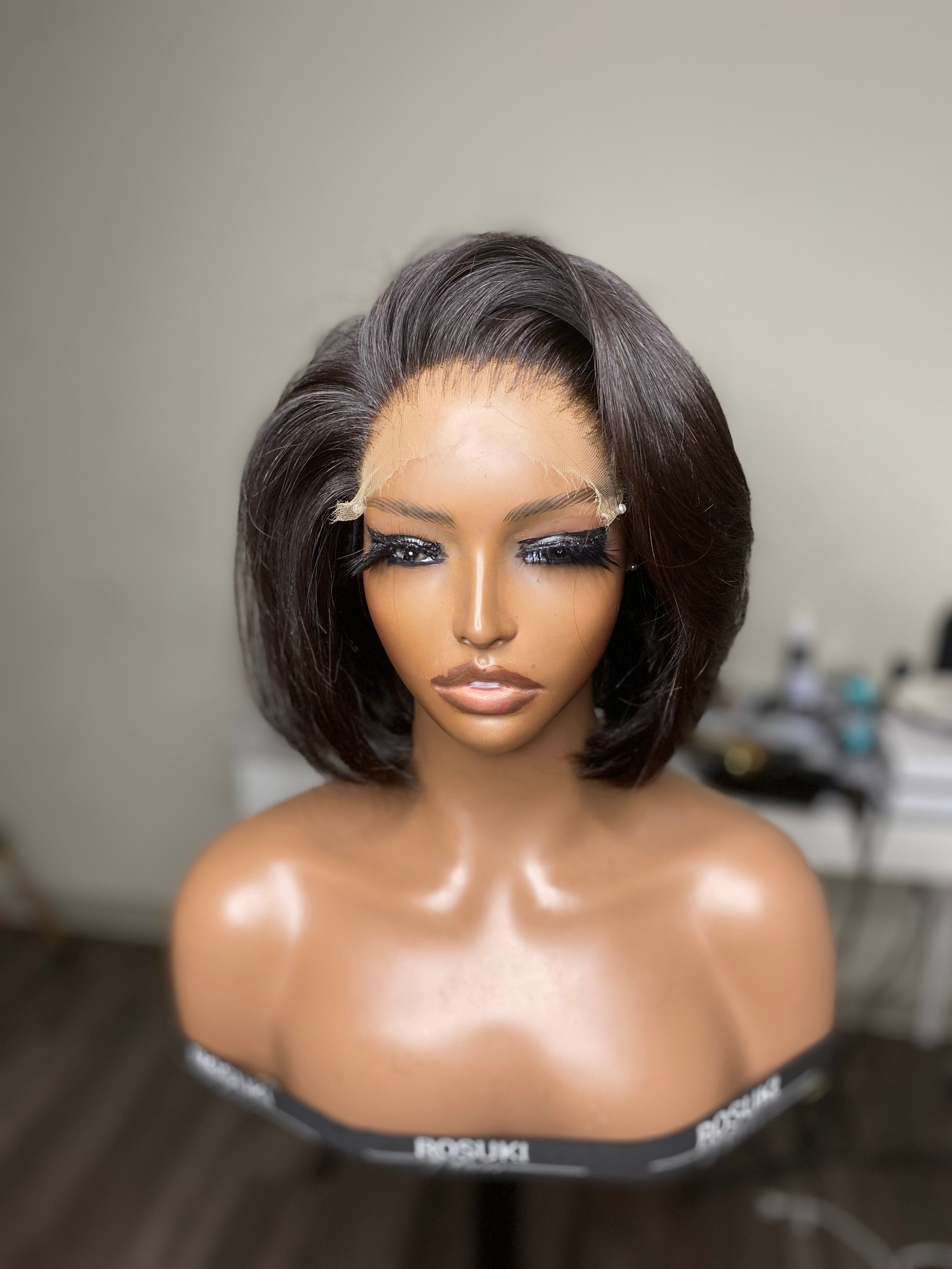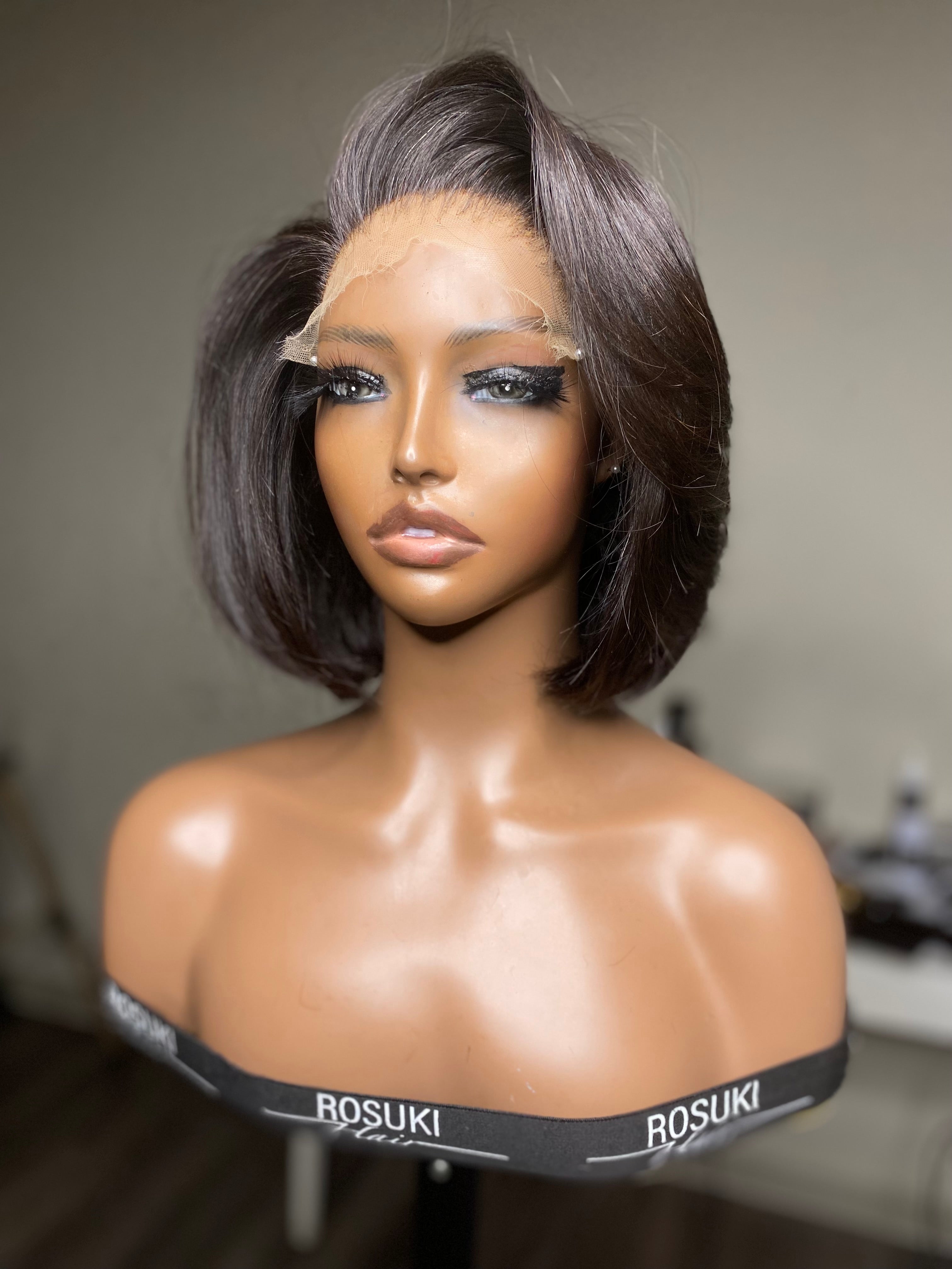 IMPORTANT INFORMATION, PLEASE READ!It is very important to know the circumference of your head measurement because it is needed to know which wig cap size will fit your head. If you are a half a size, its recommended to go up a size.Medium size cap fits most people and you can adjust the elastic band to fit properly, with that being said, Rosuki Hair will not take any responsibility if the cap does not fit right, so you have to know your head measurements. All machine made units are ready to be worn right out of the packaging after makeup (foundation/ lace tint) is used to blend transparent/ HD lace! ALL SALES ARE FINAL ROSUKI BOB - PRE ORDER Glueless custom made in 7-14business days Hair length: 10-14 inches Cap size : medium (22-22.5") Construction: machine wefted Customized closure unit. Hair Type: 100% Peruvian Bundles : three bundles and HD 5x5 closure Hair color: Natural black Hairline: semi pre-plucked Elastic band: YES